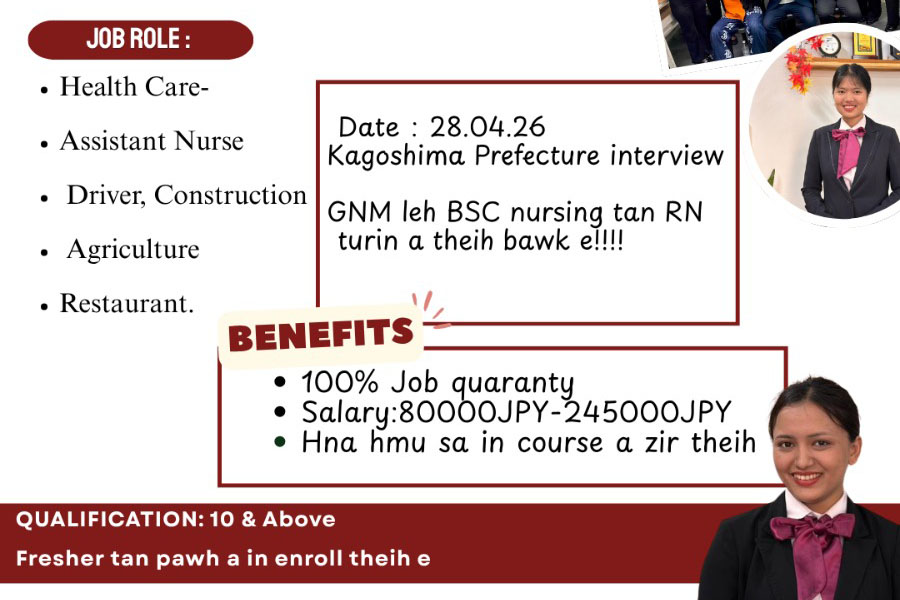 April 28, 2026 hian Beer Seba Center, Aizawl ah Japan ram aṭangin company engemaw zah hna la turin an rawn kal dawn a, Japan ram a hna thawk duh te tan English in interview an rawn nei nghal ang. Dil tur hian pawl sawm pass a ngai a, Japan ṭawng thiam sa lo tan pawh interview a hmachhawn theih ang.
